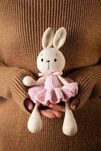 Описание изготовления игрушки-зайчика с помощью техники амигуруми и крючка, укутанного одеялом.